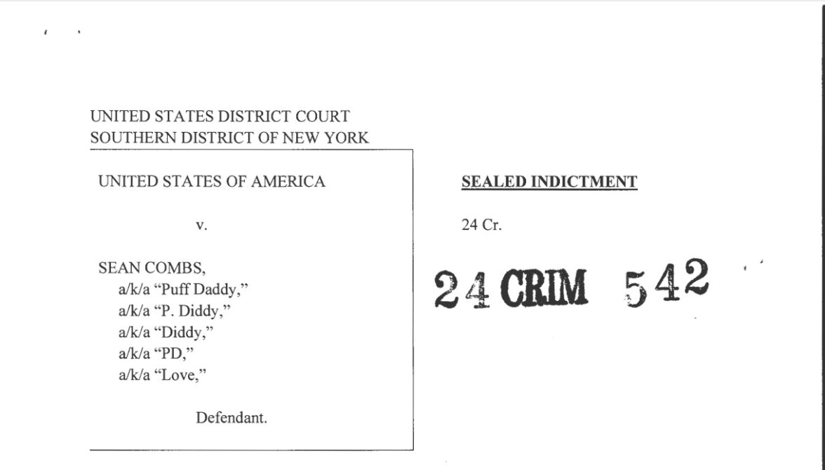 В 14-страничном обвинительном заключении по делу «Соединенные Штаты Америки против Шона Комбса, он же “Пафф Дэдди”, он же “П. Дидди”, он же “Дидди”, он же “П.Д.”, он же “Лав”» утверждается, что обвиняемый «оскорблял, угрожал и принуждал женщин и других людей вокруг него удовлетворять его сексуальные желания, защищать его репутацию и скрывать от других лиц его поведение». Для этого, согласно обвинительному заключению, Комбс использовал возможности своей бизнес-империи, которую он возглавлял и контролировал, создав тем самым преступное сообщество «члены и сообщники которого занимались и пытались заниматься, среди прочих преступлений, секс-торговлей, эксплуатацией принудительного труда, похищением людей, поджогами, взяточничеством и воспрепятствованием правосудию».
