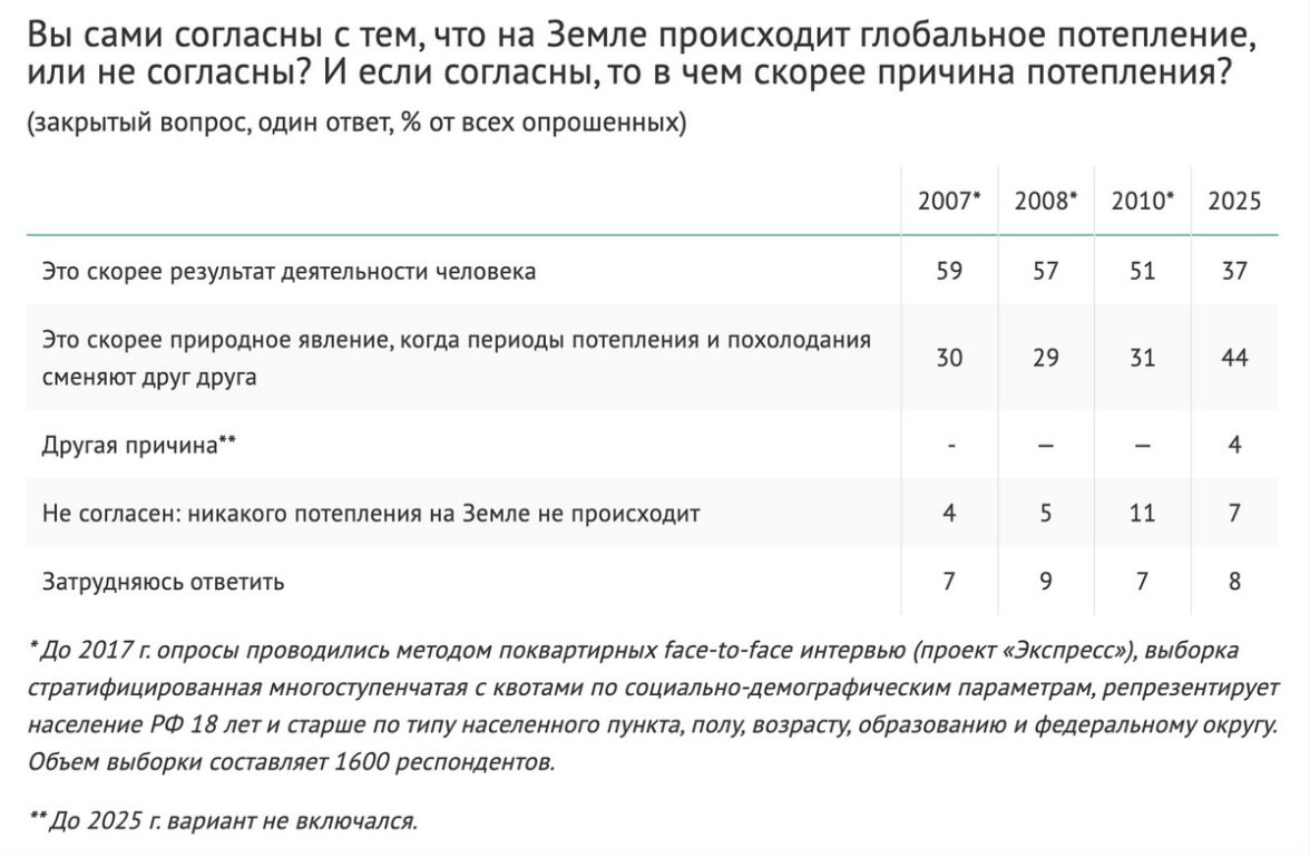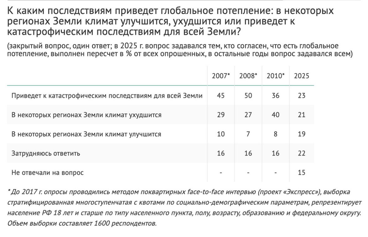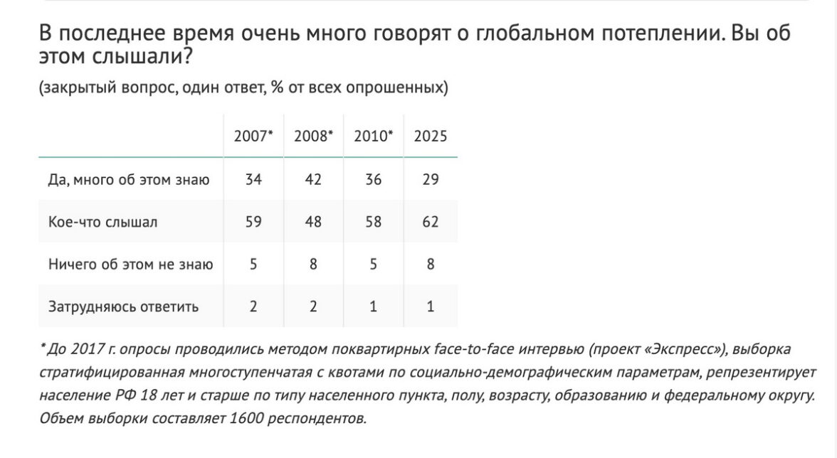 На вопрос исследователей «В последнее время очень много говорят о глобальном потеплении. Вы об этом слышали?» почти две трети россиян ответили, что кое-что слышали. Ранее мнение россиян о климате и глобальном потеплении ВЦИОМ узнавал в 2007-м, 2008-м и 2010 году. Серьезных изменений по сравнению с результатами прошлых лет не произошло. И в прошлом «кое-что слышал» было самым частым ответом.