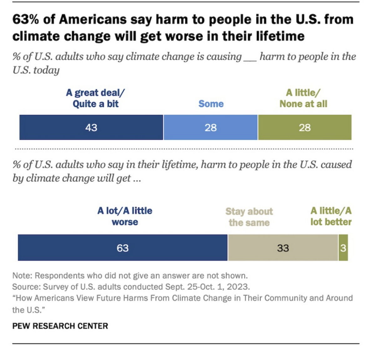 Опрос Pew Research Center, проведенный в 2023 году, показал, что большинство американцев считает, что изменение климата оказывает отрицательное влияние на их страну уже сейчас, а в будущем ситуация только ухудшится. (Термин «глобальное потепление» в США стараются реже употреблять в медиа как менее точный, так как в результате изменения климата теплеет не во всех регионах планеты).