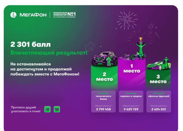 Механика предельно проста и интуитивно понятна: погонять сможет даже тот, кто увлёкся геймерством совсем недавно. Да и потом, проект создан в духе популярных игр нашего детства, а значит, играть в гоночки у нас в крови. Лёгкими движениями игрок обгоняет на трассе соперников и собирает бонусы, влияющие на личный и командный зачёты. МегаГонка не просто определяет, кто здесь самый быстрый, но и напоминает о важном: на каких бы скоростях сегодня ни приходилось жить, в компании заботятся о хорошем самочувствии работника, а также его профессиональном и личностном развитии.