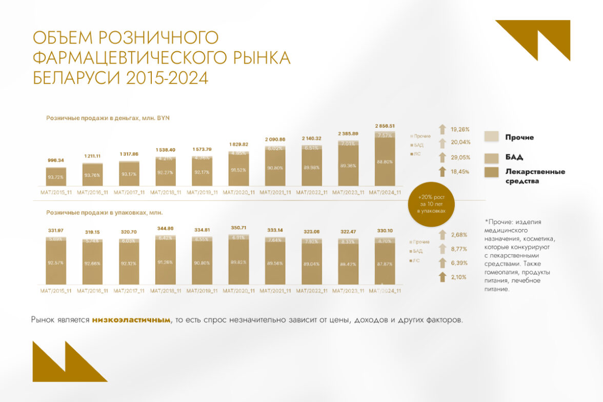 Белорусский рынок демонстрирует устойчивый рост как в рублях, так и в упаковках. Особенно быстро развивается сегмент БАДов — витамины, минеральные добавки и гиполипидемические средства входят в число самых востребованных. Ценообразование чувствительно к колебаниям валют и логистическим расходам, однако доля лекарств в потребительской корзине населения остается стабильной — около 4%.