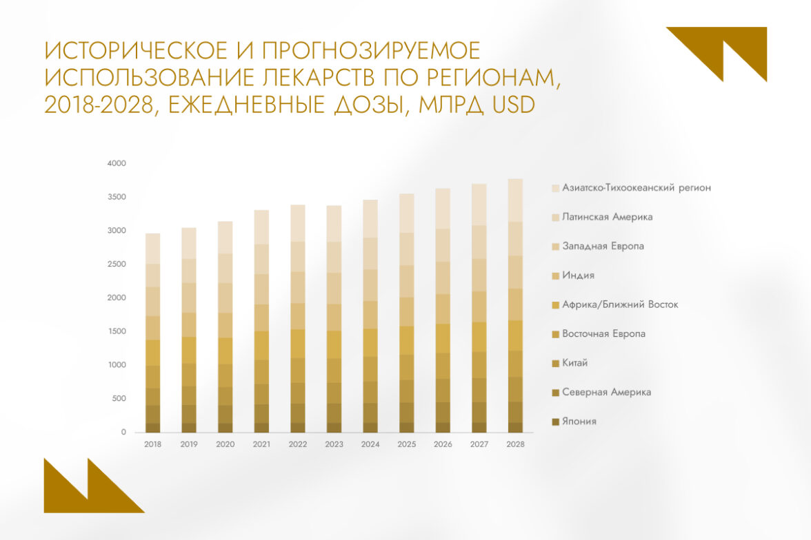 В целом, к 2028 году в Северной и Латинской Америке, Восточной и Западной Европе, а также в Африке и на Ближнем Востоке расходы на фармацевтические товары вырастут более чем на 30%. Это говорит не только о росте объемов потребления, но и о смещении спроса в сторону более дорогостоящих, высокотехнологичных препаратов.