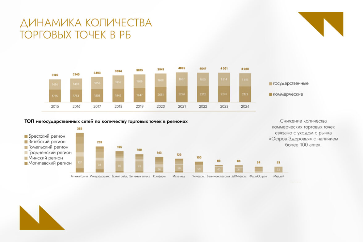 Ведущие позиции занимают частные сети: «Аптека-Групп», «Интерфармакс», «Брититрейд». Всего в стране работает 35 фармпредприятий, при этом 8 из топ-10 по объему продаж — белорусские. Лидеры: Искамед, Белфарм, Лекфарм, Боримед, Фармлэнд.