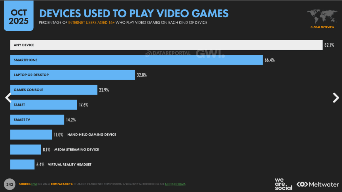 66% геймеров используют смартфоны для видеоигр, что делает мобильный гейминг одной из самых вовлекающих digital-сред.