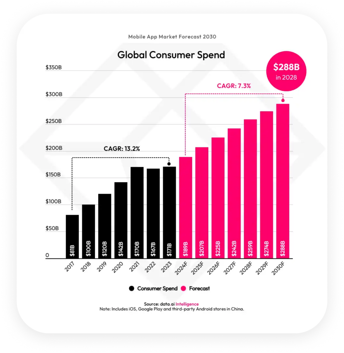 Аналитики ожидают, что среднегодовой прирост трат пользователей на мобильные приложения до 2030 года будет составлять 7,3%. Звучит довольно оптимистично — в период с 2021 до 2023 видим явное замедление.