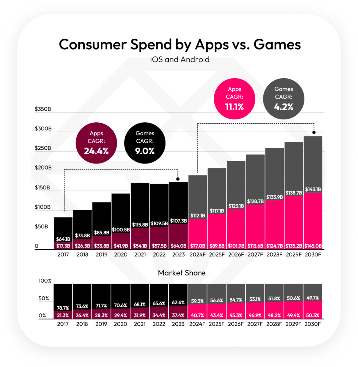 Темп роста доходов должен замедлиться: для игр с 24,4% до 11,1%, для приложений с 9% до 4,2%. Расходы пользователей на игры и приложения сравняются только в 2030 году.