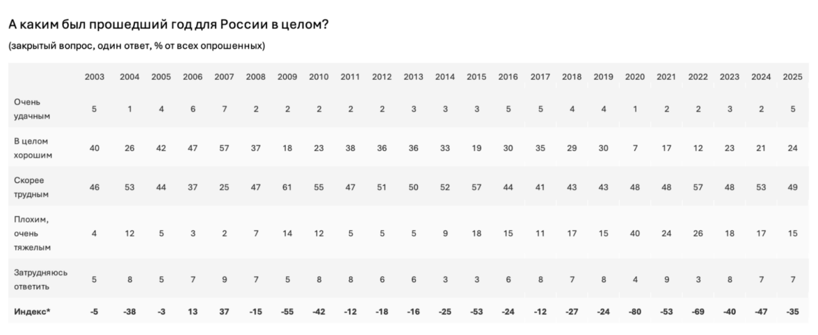 Оценка россиянами уходящего года для России в 2003–2025 годах.