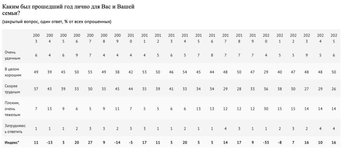ВЦИОМ ежегодно на основе своих опросов высчитывает индексы личных итогов года и итогов года для страны в целом — на основе ответов на вопросы «Каким был прошедший год лично для Вас и Вашей семьи?» и «Каким был прошедший год для России в целом?» Индексы рассчитываются как разница положительных и отрицательных оценок. Значение индексов может колебаться в диапазоне от −100 до 100 пунктов. Чем выше значение индексов, тем более позитивно респонденты оценивают прошедший год.