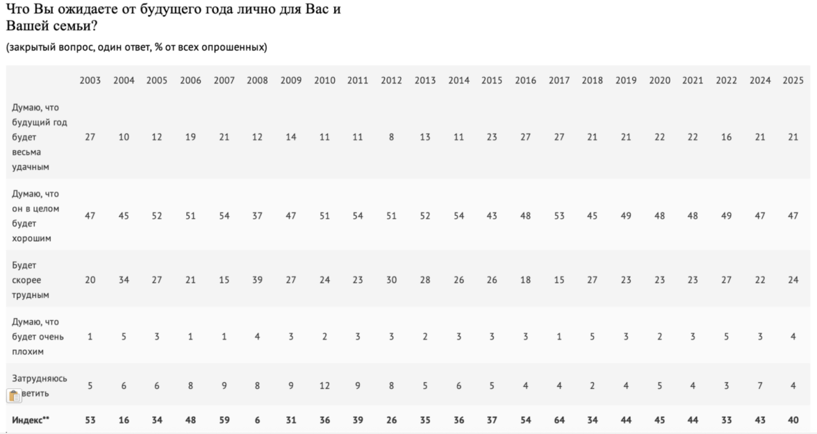 Ожидания россиян относительно наступающего года для для них лично в 2003–2025 годах.