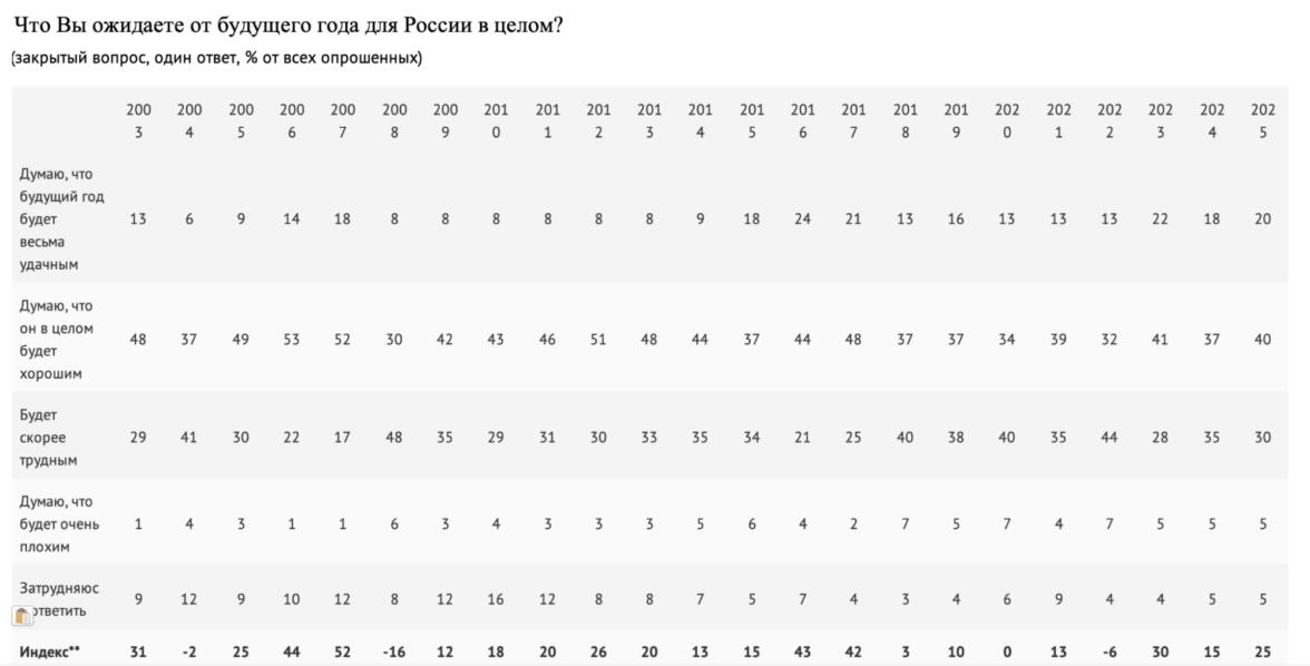 Ожидания россиян относительно наступающего года в 2003–2025 годах.
