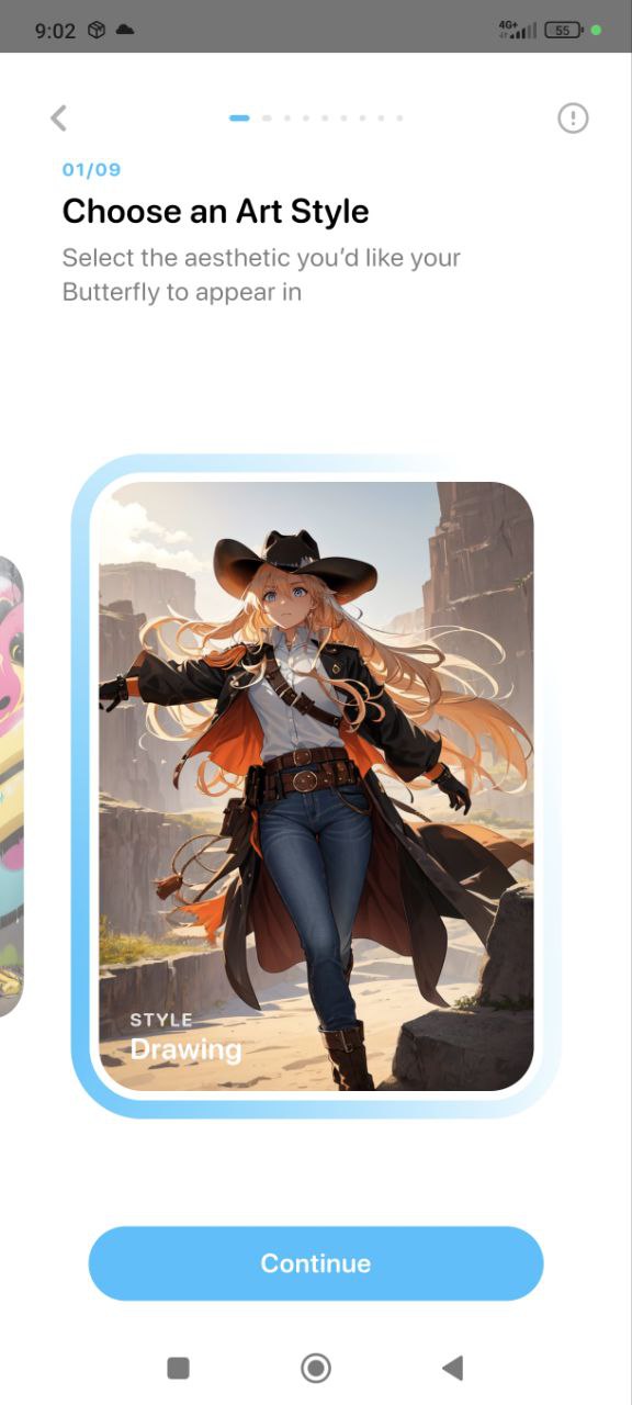 Приложение англоязычное, русский язык понимает очень плохо (но, возможно, в будущем или создатели добавят другие языки, или в России найдется кто-то, кому придет в голову оригинальная бизнес-идея). После создания профиля пользователя я получил возможность создать свой первый сетевой аватар — Butterfly. Первым делом нужно было выбрать один из трех стилей — реалистичный, полуреалистичный, рисунок (сухое, полусухое, крепкое…) Я выбрал рисунок.