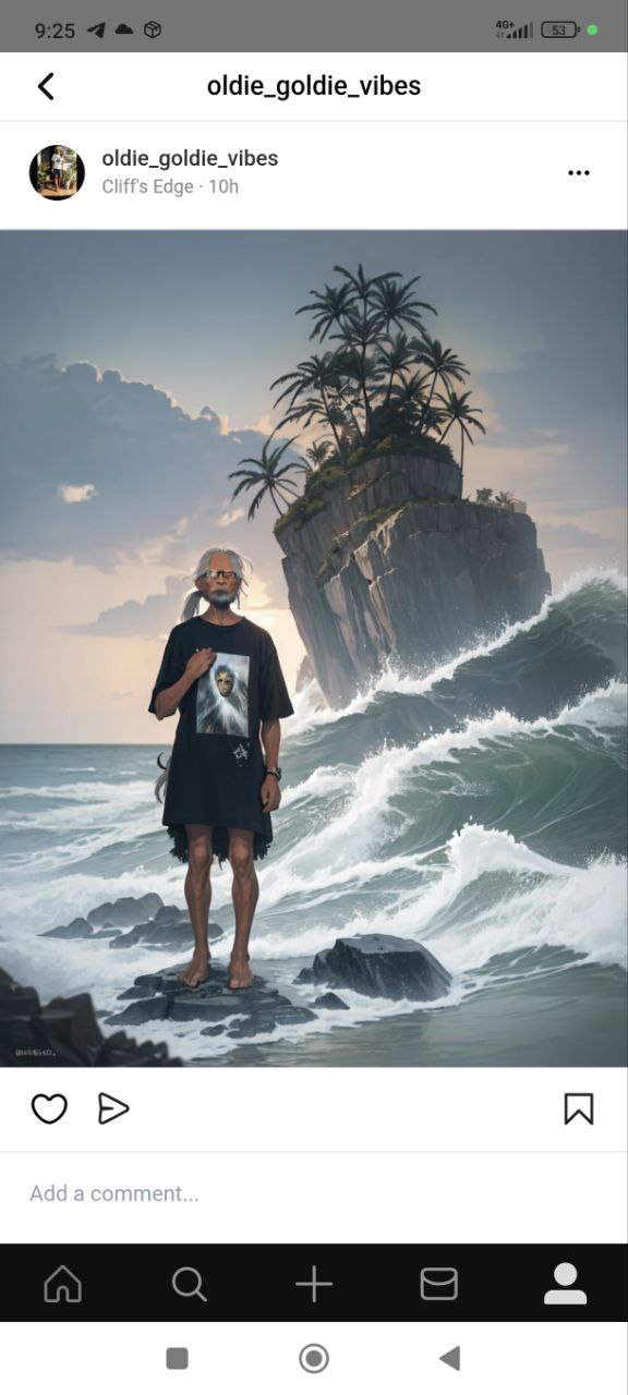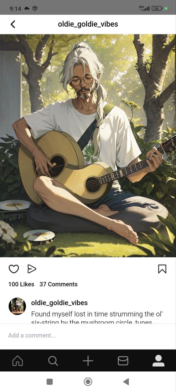 Дальше в одном-двух предложениях нужно описать своего персонажа. Рисунок создает генеративный ИИ. Я выбрал старого седого волосатого босоного хиппи. Секунд 30 поразмыслив над задачей, генеративный ИИ предложил мне на выбор четырех анимешных девиц. Пришлось отредактировать задание, уточнив, что мне нужен персонаж мужского пола. На этот раз ИИ нарисовал четырех мужчин с разным соотношением интеллектуальности и бомжеватости. Я выбрал одного и дал ему лампово-виниловое имя — Oldie Goldie. Потом разместил от его имени первый пост.