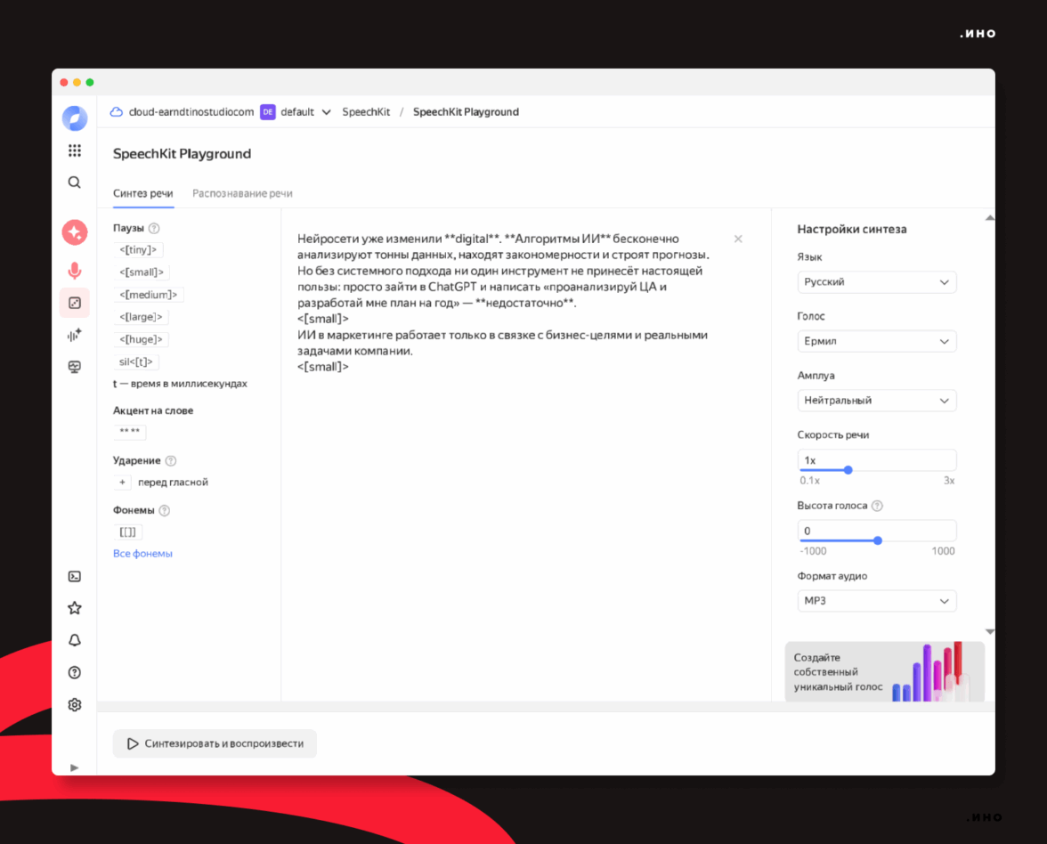Интерфейс Yandex SpeechKit — пример настройки параметров для озвучки текста