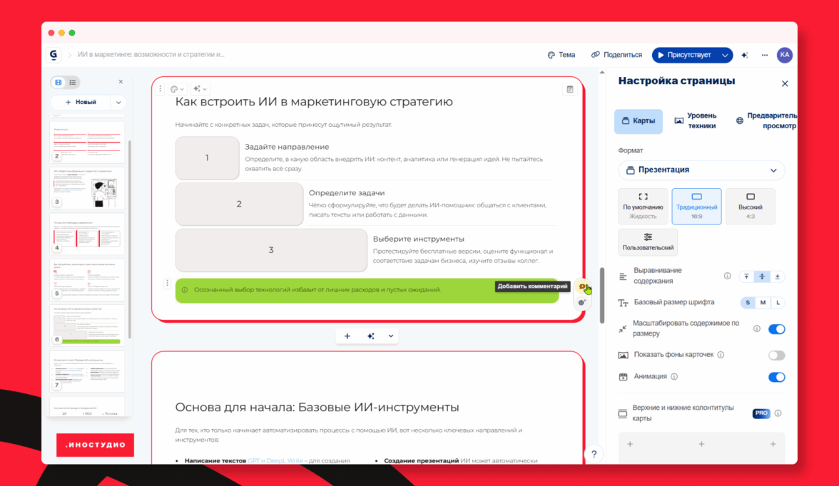 Пример генерации презентации с помощью ИИ — Gamma выдала структурированный макет презентации на 10 слайдов с основной информацией из статьи в фирменном стиле Иностудио