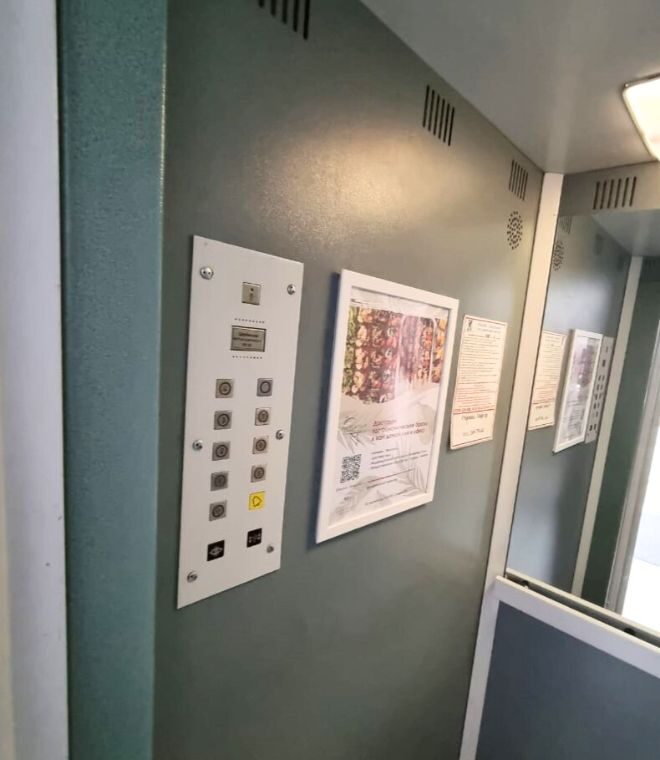 Посоветовали клиенту недорогие, но при этом очень эффективные носители — стикеры в лифтах размера А3. Формат достаточно заметный и крупный для небольшого лифтового пространства, текст на макете легко читается, печать таких макетов можно осуществить в любой типографии: просто, дешево и быстро.