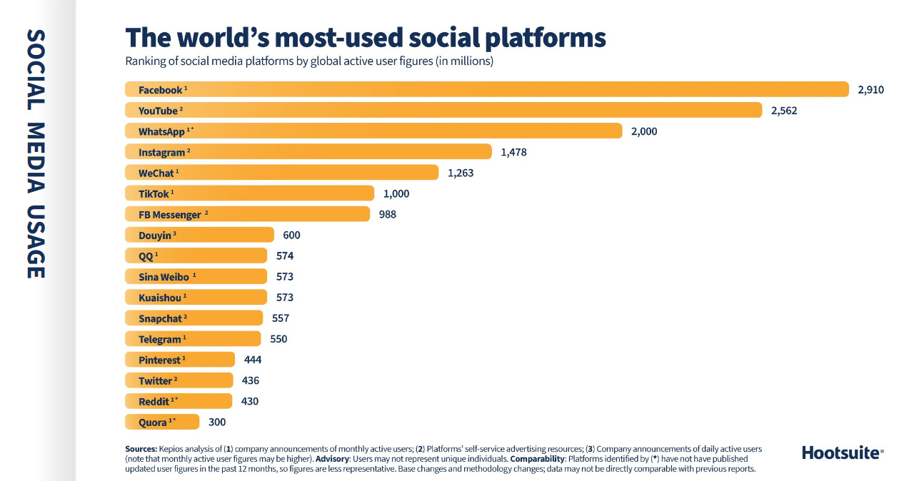 Канадский дашборд Hootsuite совместно с международным креативным агентством We are social опубликовали отчет «Digital 2022 — Social Media Marketing & Management Dashboard». Согласно этим данным, суммарное количество интернет-пользователей во всем мире почти достигло 5 млрд, 4,62 из которых — пользователи соцсетей. В 2021 году тех, кто стал пользователем какой-либо соцсети, стало на 10% больше.