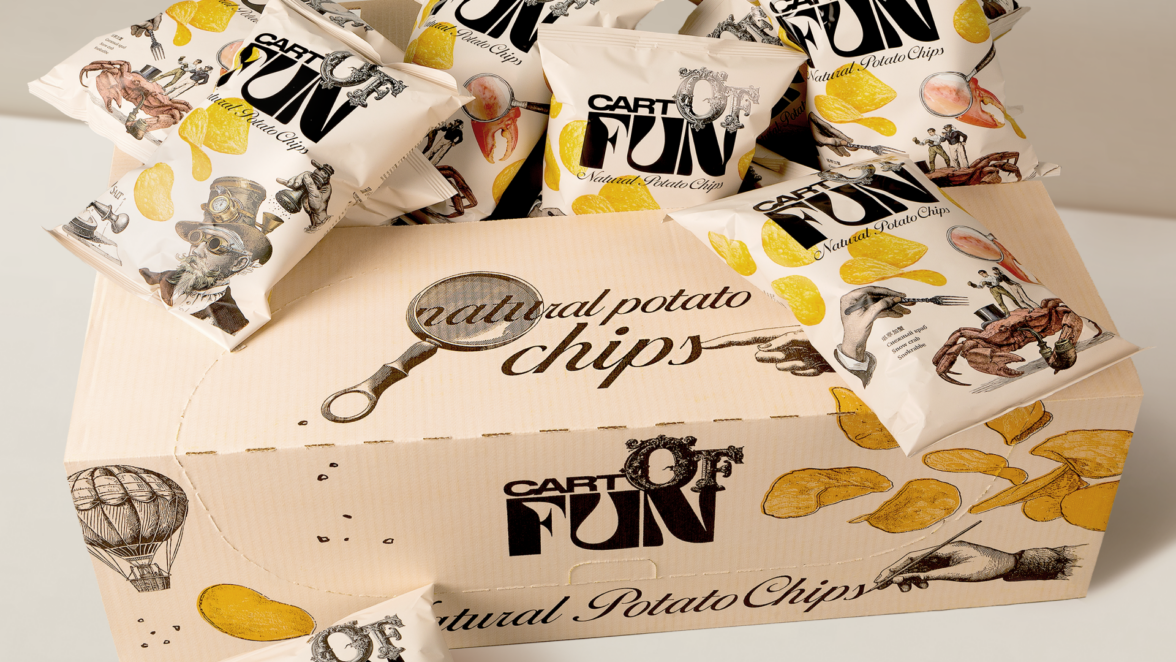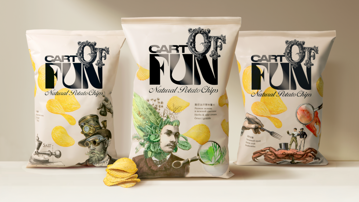 Как решили задачу: Провели исследование и анализ трендов на рынке. Изучили конкурентов, чтобы найти то, что поможет отстроится от них, а нам выбиться из информационного шума. Разобрали различные ситуации потребления. Изучили то, как живёт наша целевая аудитория. Выяснили, что для них сейчас на пике форматов юмора ирония и постирония. Данный формат общения является ответом на стресс. А чипсы — это всегда отличный повод перезагрузиться. Таким образом, родился концепт: «Иронично-сюрреалистичная картошка». Эта идея и легла в основу названия CartOfFun. С одной стороны, максимально простое, а с другой — максимально постироничное. Потому что только смелый бренд может превратить обычный снек во что-то классное и яркое. Что и нашло свое отражение в немного безумном, но таком эстетичном дизайне, наполненном множеством удивительных деталей. CartOfFun — ироничный, яркий, ломающий стереотипы и переворачивающий всё с ног на голову бренд, готовый радовать и удивлять ценителей прекрасного.