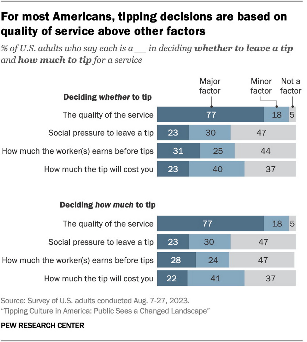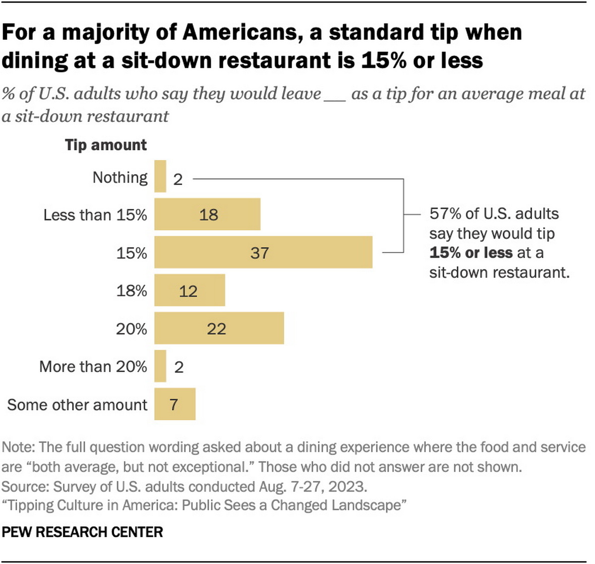 Американская негосударственная социологическая компания The Pew Research Center провела опрос, чтобы изучить отношение американцев к чаевым, а также их практики неформального поощрения работников сферы услуг. В исследовании, проходившим с 7 по 27 августа 2023 года, приняли участие 11 945 американцев старше 18 лет.