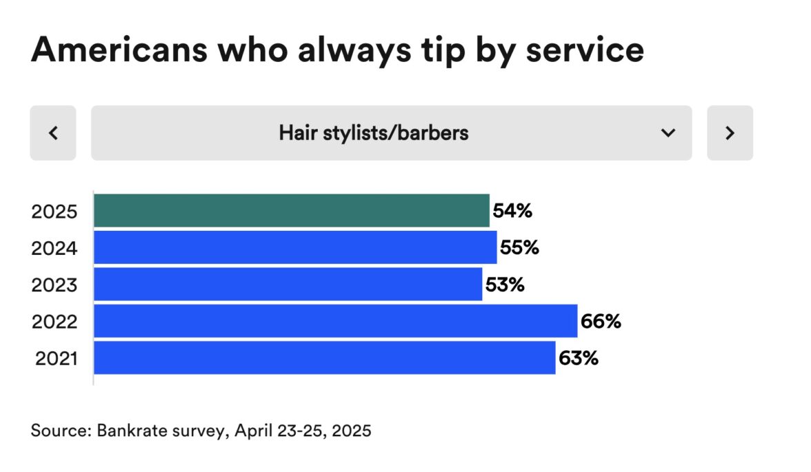 Число тех, кто всегда оставляет чаевые парикмахерам и стилистам, не сильно изменилось по сравнению с прошлым годом (54% против 55% в 2024 году), но также ниже уровня 2021–2022 годов.