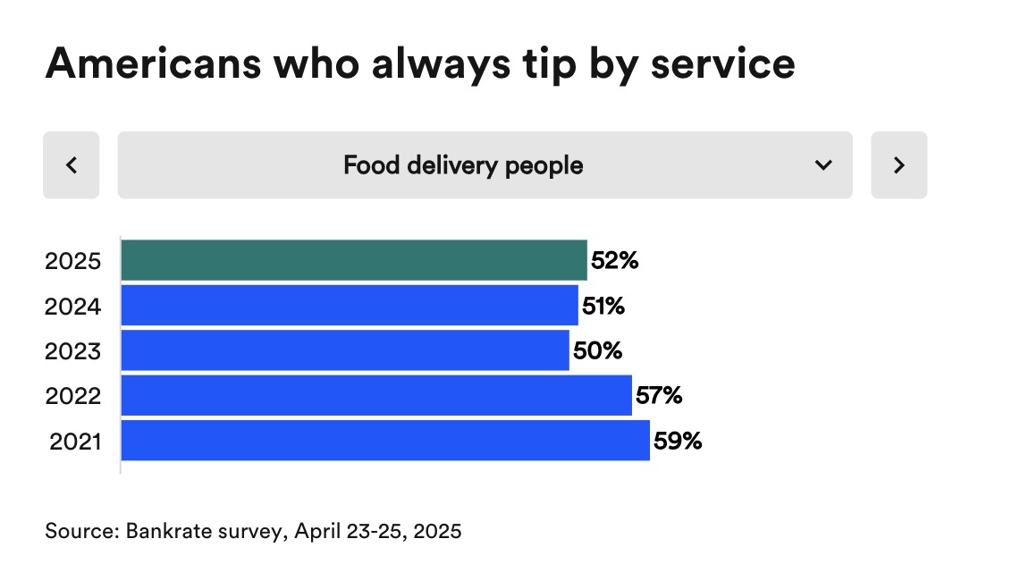 Практически такая же ситуация с чаевыми, которые американцы дают доставщикам продуктов — примерно как год назад, но меньше, чем в 2021–2022 году.