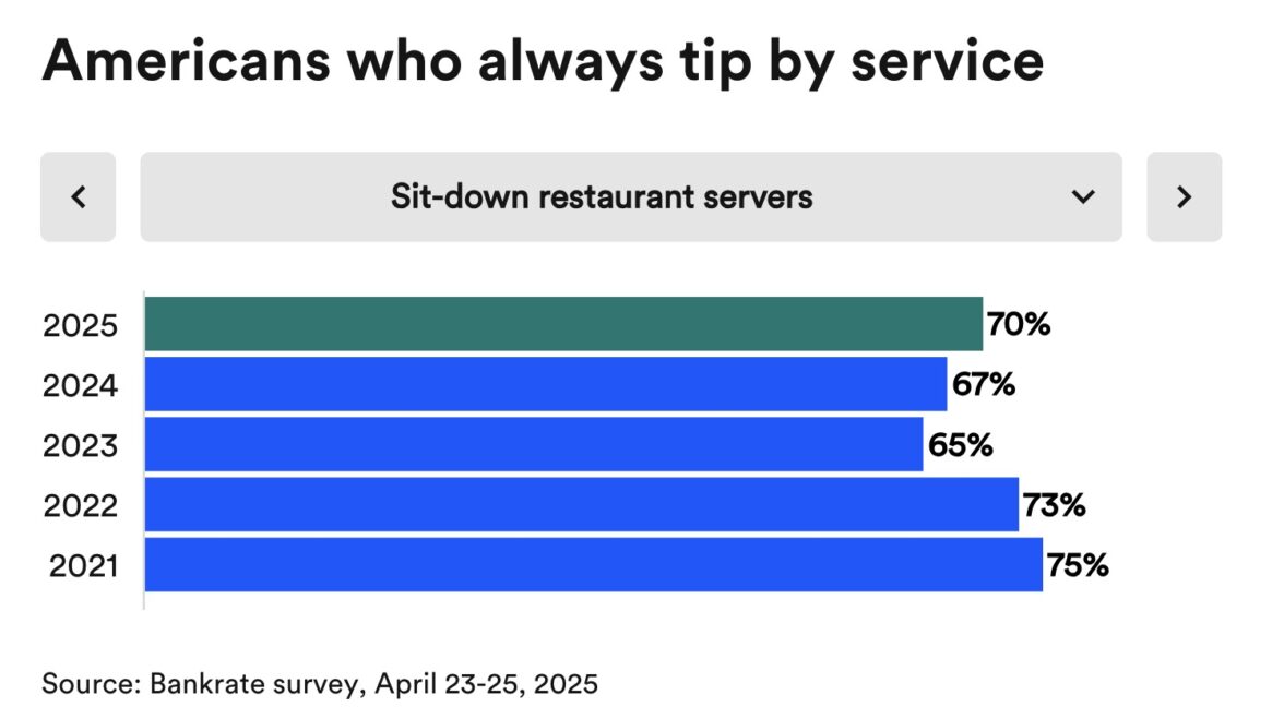 Как за последние годы изменилось число американцев, всегда оставляющих чаевые в ресторанах с обслуживанием сидячих мест