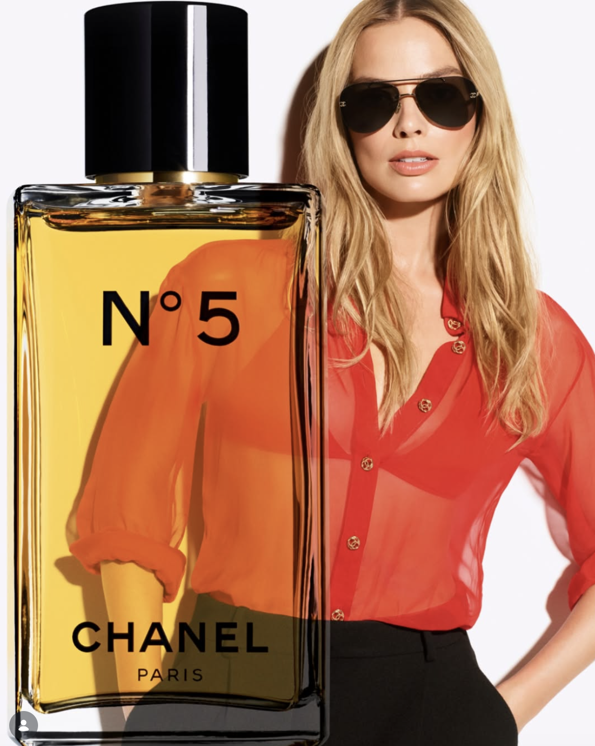 Марго Робби позирует рядом с культовым флаконом духов в красной полупрозрачной блузке с длинными рукавами и золотыми пуговицами, черных брюках классического кроя с высокой талией и темных солнцезащитных очках-авиаторах. Над макияжем работала легендарная Пати Дуброфф.