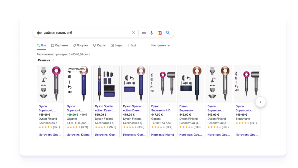 Например, человек ввел в поисковике словосочетание «купить фен Дайсон спб». Контекстная реклама проанализирует ключевые слова и предложит объявления с нужным товаром.