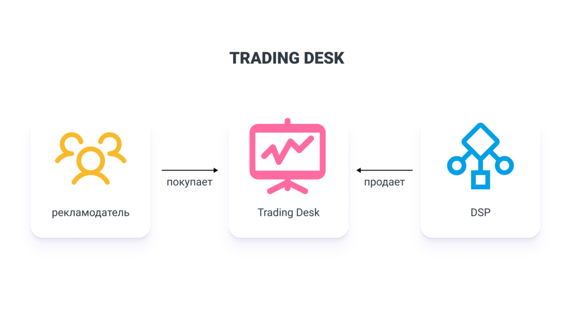 Trading desk — компания или отдел, который занимается покупкой рекламного инвентаря в режиме реального времени. Процесс происходит через Ad Exchange и другие платформы рекламного обмена.