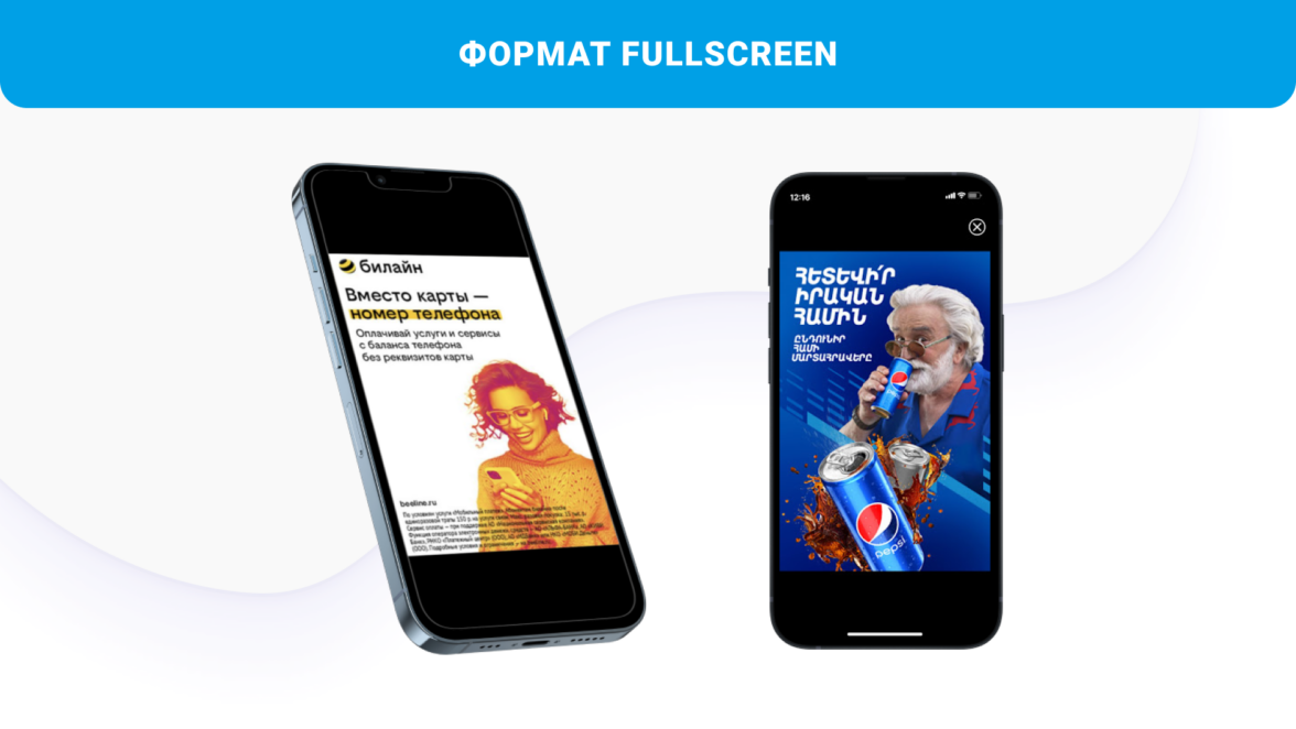 Размер: рекламные сообщения должны соответствовать размерам, которые заранее определены техническими требованиями системы. Например, формат Fullscreen в компании BYYD включает в себя разные разрешения: 320х480, 768х1024, 320х50 и другие.