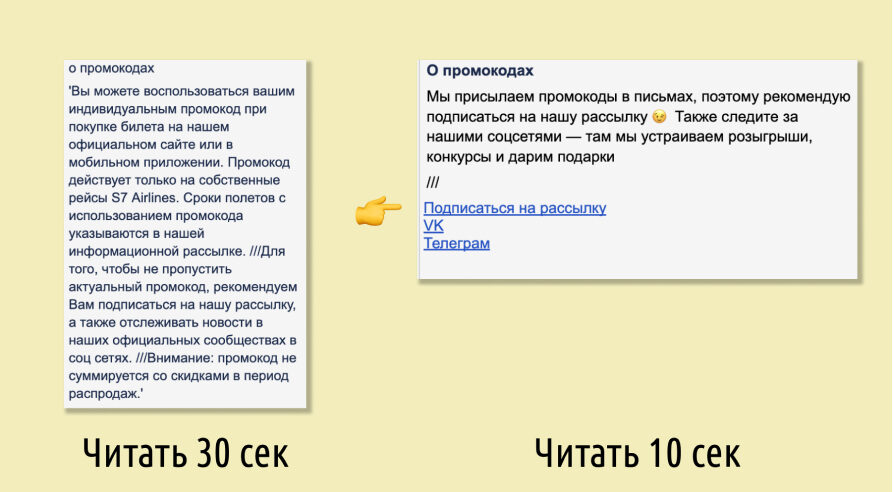 Мы проанализировали каждую реплику и определили её полезное действие. Например, если человек интересуется промокодом, значит он хочет его найти. Поэтому мы сразу говорим, что размещаем промокоды в письмах, ВК и Телеграме. Такая максимизация полезного действия вдобавок сокращает текст, а значит экономит время путешественника.