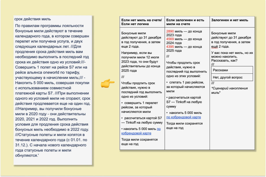 Наша задача состояла в том, чтобы понять, какой ответ хочет увидеть пользователь. Если он спрашивает срок действия миль — нужно сразу сказать срок, если уточняет, что нужно для перелета — перечислить документы, а если спрашивает, как выбрать место — отправить ссылку на выбор мест. Для этого мы переделали обычные ответы в сценарии, то есть продумали, как дать самый персональный ответ в зависимости от этапа, на котором находился путешественник — есть ли у него мили на счету, зарегистрирован ли он в программе лояльности, сколько полетов уже совершил и много других параметров.