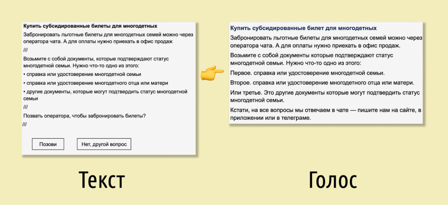 В S7 Airlines есть Контактный центр, где Элли будет отвечать на вопросы путешественников голосом. Поэтому мы отредактировали текстовые сообщения так, чтобы казалось, что Элли не бот, а живой человек. Для этого мы генерировали голос в специальном сервисе, слушали и редактировали текст: убрали лишние знаки препинания, заменяли маркированные списки на перечисления «первое», «второе», а в словах, где можно сделать ошибку в ударении, ставили «+».