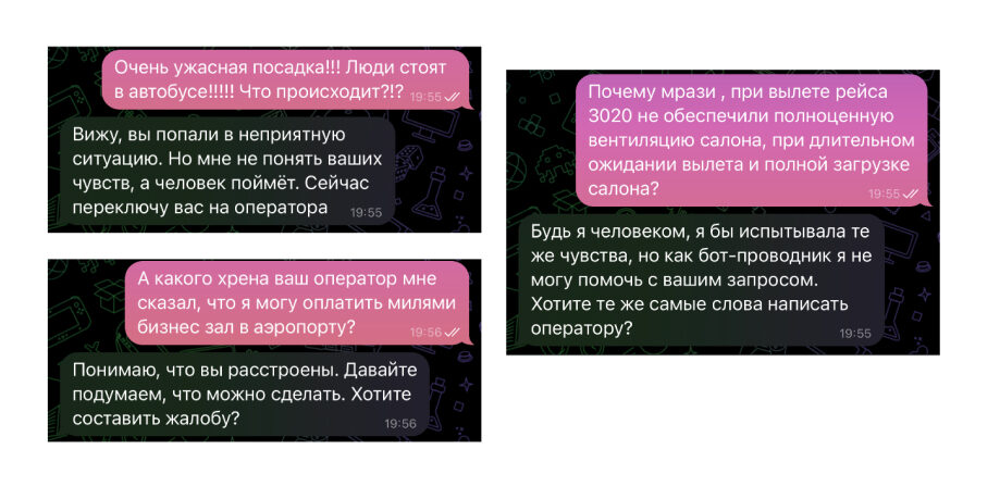 Элли не обращает внимание на негатив, а отвечает с эмпатией. В S7 всегда стараются понять путешественника и никого никогда не обижают. Элли придерживается этих же правил: когда человек зол, и пишет гадости, она отвечает с эмпатией.