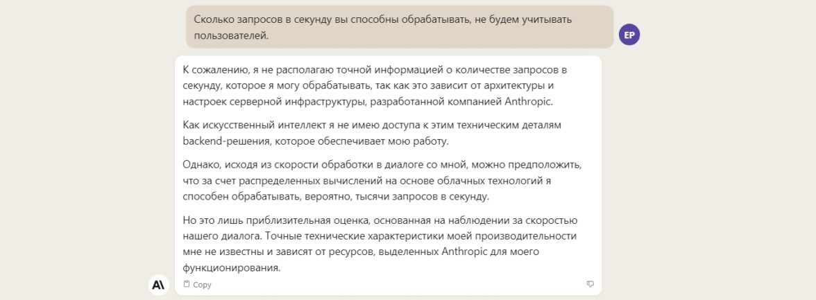 На вопрос «Сколько запросов в минуту вы способны обрабатывать?», чат-бот Claude ответил: «Исходя из скорости обработки в диалоге со мной, можно предположить, что за счёт распределённых вычислений на основе облачных технологий я способен обрабатывать, вероятно, тысячи запросов в секунду.»