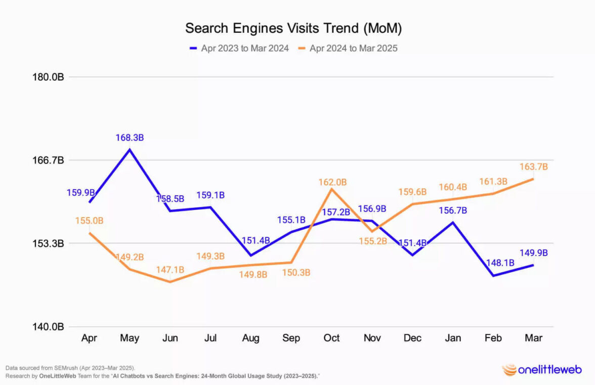 Но несмотря на высокие темпы роста, масштабная диспропорция между аудиторией чат-ботов и классических поисковых систем сохраняется. За тот же период сайты поисковиков, таких как Google, Bing и Yahoo, зафиксировали 1,86 триллиона визитов, что на 0,51% меньше, чем годом ранее. Причем после падения в середине 2024 года в последние месяцы зафиксирован отскок: в марте 2025 года совокупный месячный трафик поисковиков достиг 163,7 миллиарда — это лучший показатель за 12 месяцев и явный признак стабилизации.