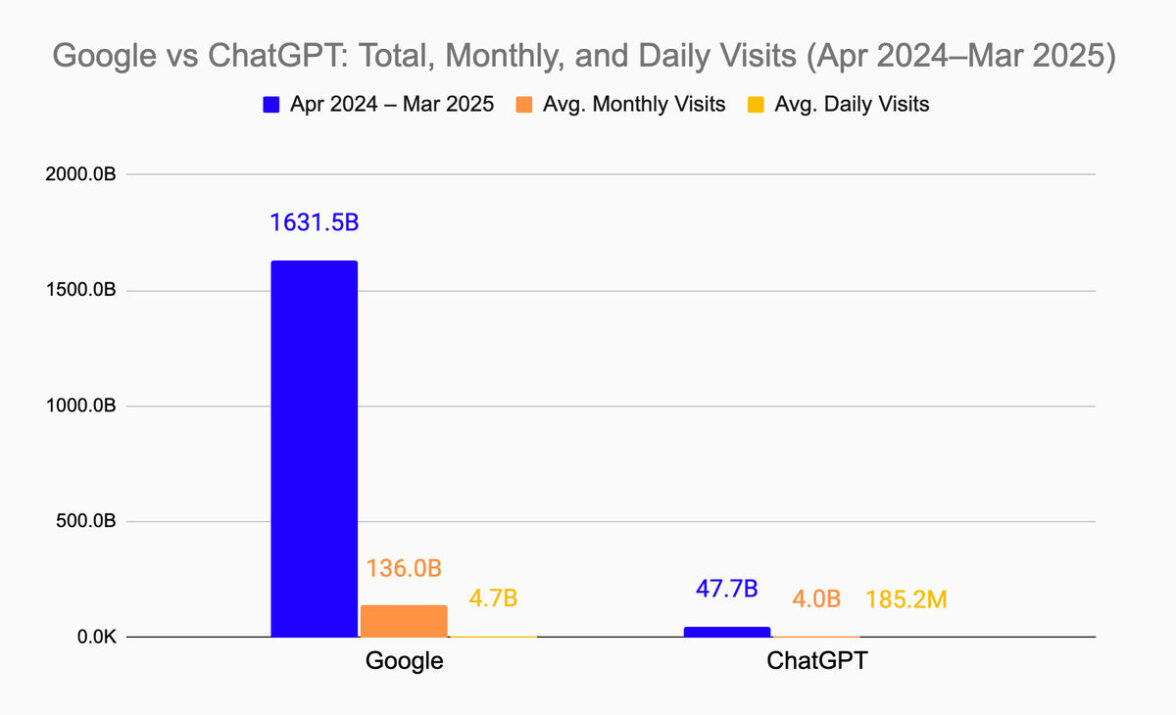 Разрыв между двумя сегментами остается внушительным: на каждый визит на сайт чат-бота приходится 34 визита на сайты поисковых систем. В ежедневном выражении это 5,5 миллиарда визитов к поисковикам против 233 миллионов к чат-ботам. За год на Google пришлось 1,63 триллиона визитов против 47,7 миллиардов (в 26 раз меньше) у ChatGPT.
