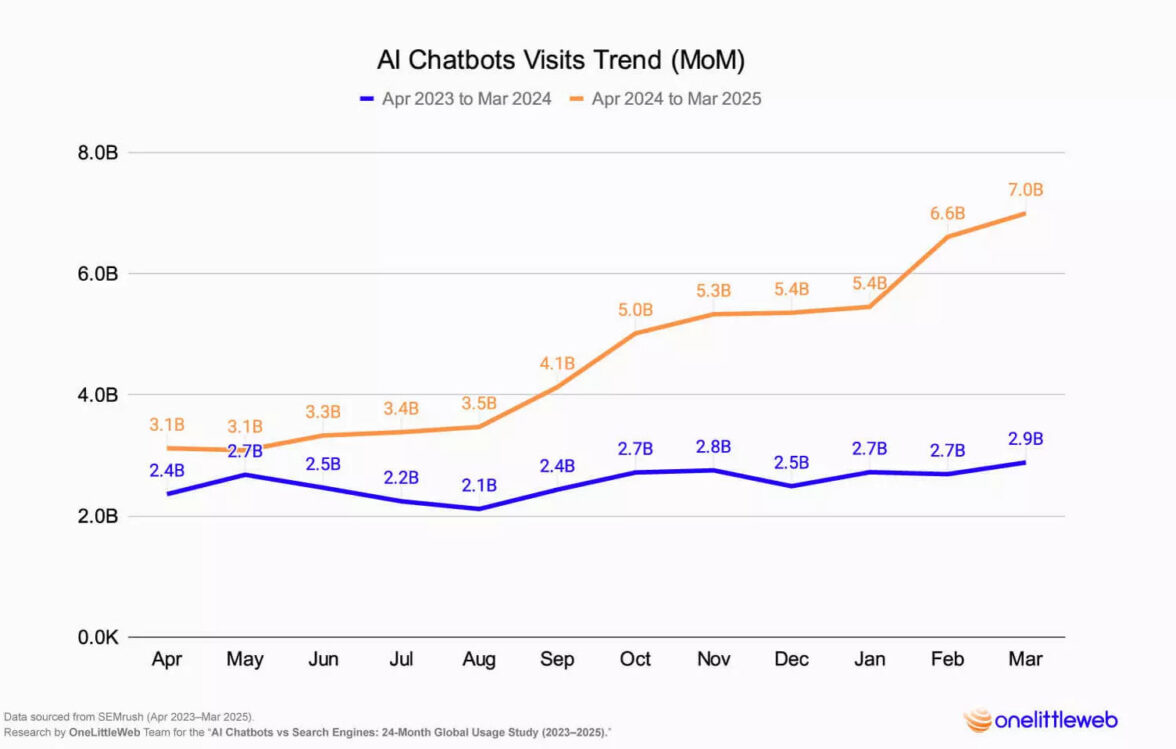Исследование, проведенное компанией OneLittleWeb, охватывает период с апреля 2023 по март 2025 года и сравнивает поведенческие метрики пользователей на сайтах крупнейших поисковых систем и чат-ботов с ИИ. В выборку вошли топ-10 платформ в обеих категориях, а основным источником данных стала аналитика от Semrush. В рамках анализа оценивались месячные и годовые изменения трафика, среднесуточные визиты, распределение долей рынка и динамика пользовательской активности.