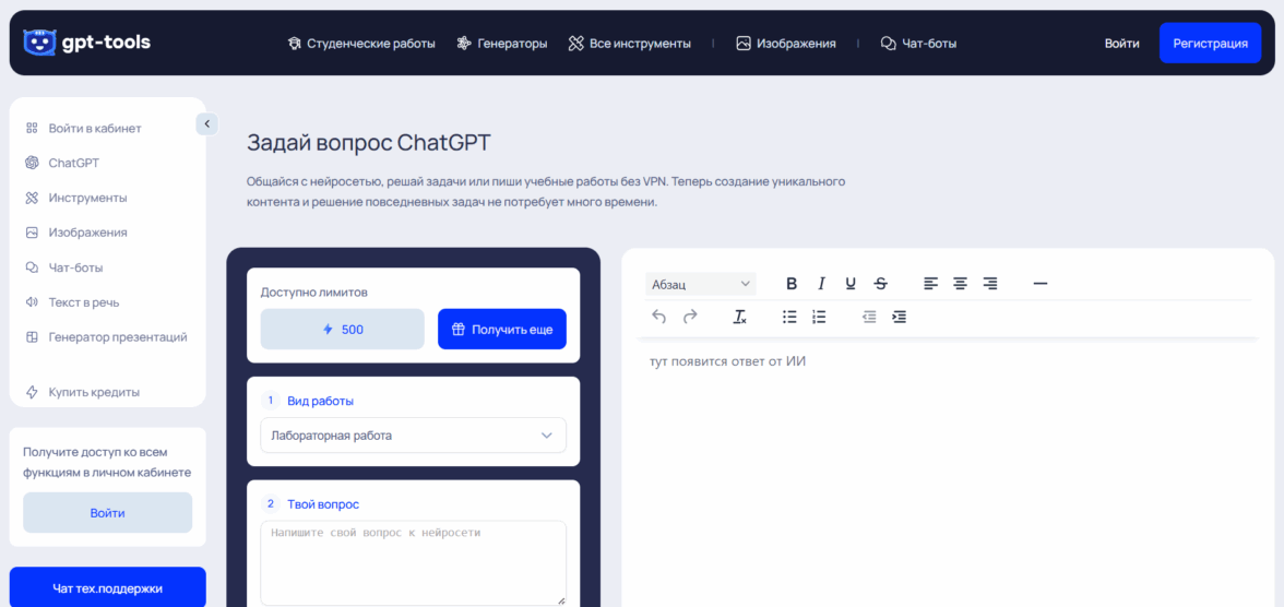 Профессиональная российская нейросеть на базе GPT, специализирующаяся на создании масштабных академических и научных текстов, курсовых и дипломных работ с теоретической и практической частями, научных статей для публикаций, рефератов с библиографией, эссе с аргументацией, отчетов по практике с анализом деятельности предприятия и SEO-статей для сайтов с оптимизацией под ключевые слова. ИИ бесплатно генерирует структурированный план без регистрации и email для оценки будущего текста, создает полноценный текст объемом до 100 страниц после регистрации с автоматическим формированием списка источников по академическим стандартам, а далее происходит детальное редактирование во встроенном ИИ-редакторе с возможностью корректировки отдельных параграфов, увеличения или сокращения фрагментов, изменения стиля и тональности, проверки грамотности, повышения уникальности через рерайт.