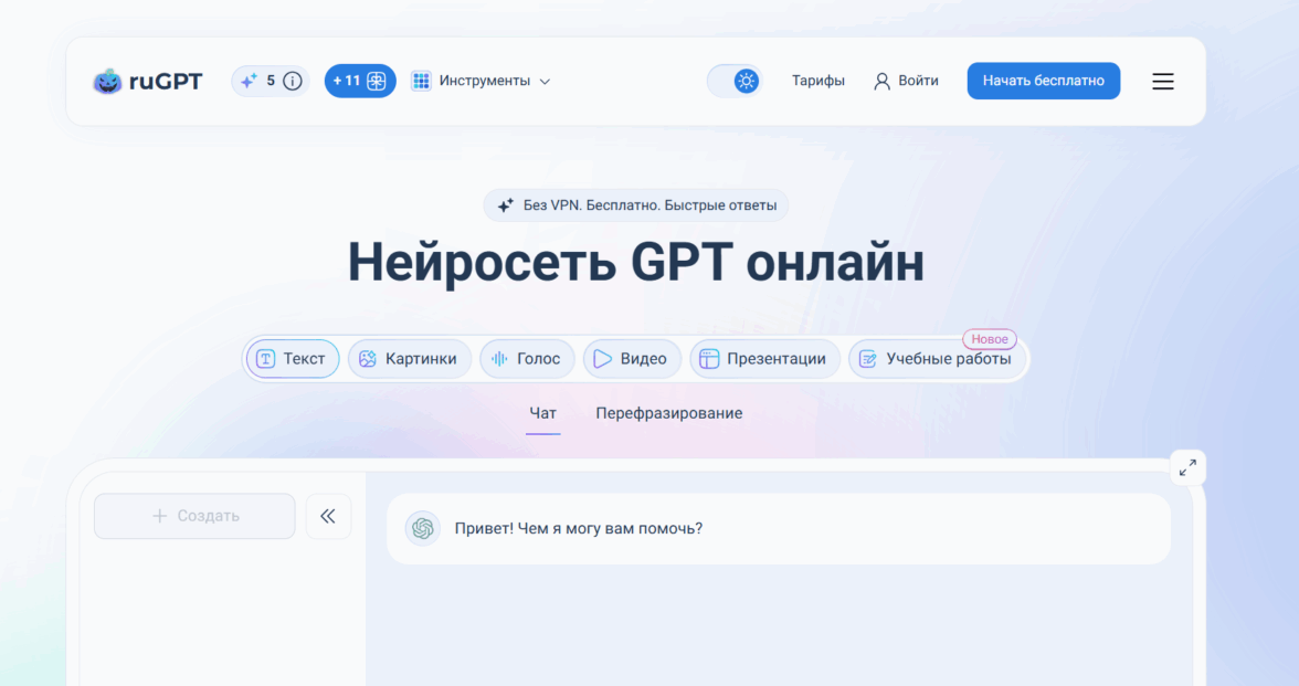 Российская ИИ-платформа с бесплатным доступом без обязательной регистрации, которая помогает писать тексты, генерировать визуальный контент, создавать видеоролики с автоматической озвучкой и решать учебные задачи по фотографии через распознавание формул и текста. Сервис предлагает доступ к топовым AI-моделям (ChatGPT-5, Claude 4, DeepSeek R1, Grok 4, Gemini 2.5 Pro) на русском языке с возможностью переключения между нейросетями для получения качественного результата. RuGPT работает в браузере и поддерживает веб-поиск для получения актуальной информации и готовится к запуску новых функций создания презентаций и углубленного анализа данных.
