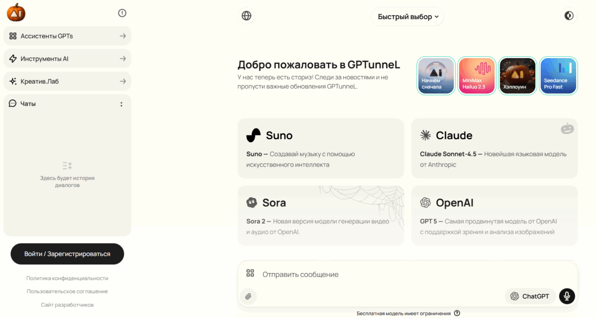 GPTunnel — сочетает в себе 100+ нейросетей с единым интерфейсом переключения между моделями за секунду