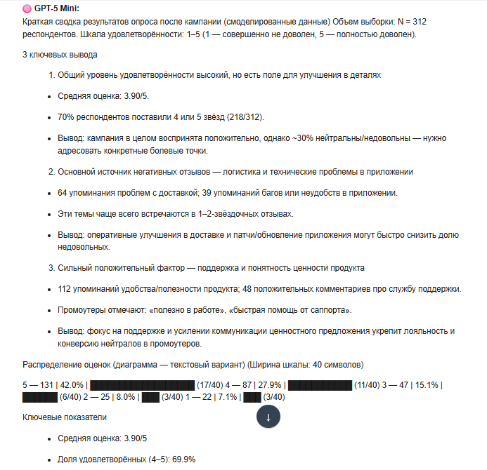Подготовь сводку инсайтов по результатам опроса клиентов после кампании. Файл содержит оценки удовлетворенности и открытые ответы. Представь 3 ключевых вывода и диаграмму с основными показателями удовлетворенности.