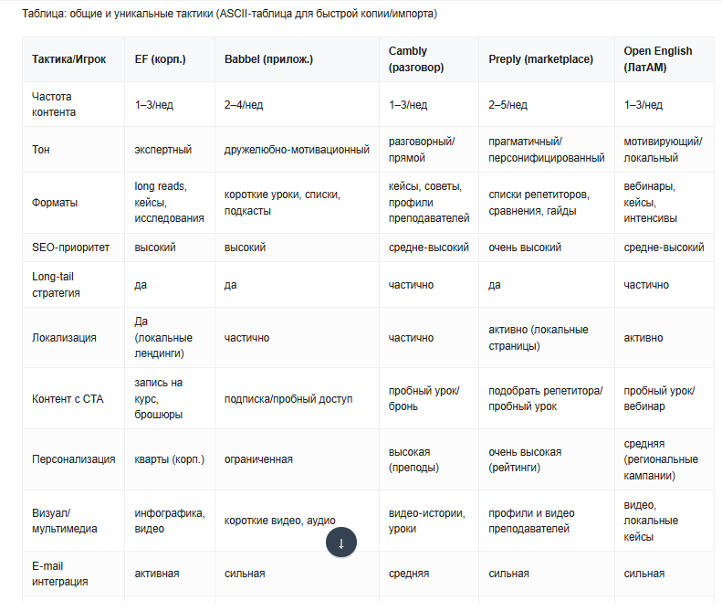 Изучи, как 5 ведущих конкурентов выстраивают свою стратегию контента в блоге. Укажи тон, темы, частоту публикаций, фокус на SEO и призывы к действию (CTA). Приведи ссылки, основные выводы и таблицу с общими и уникальными тактиками.