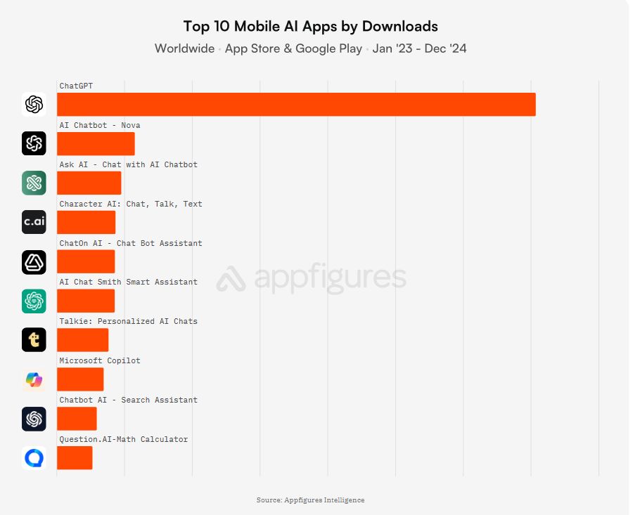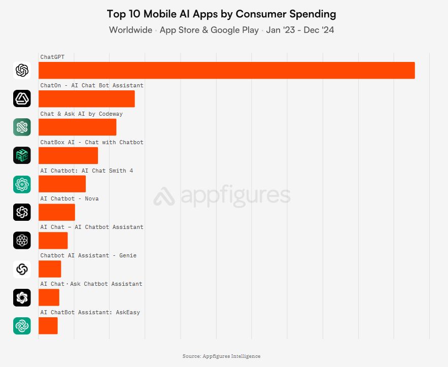 Доходы мировых разработчиков мобильных приложений с искусственным интеллектом в 2024 году выросли на 274% до $1,8 млрд. Из них 64% денег потратили американцы, с большим отрывом опережающие жителей Великобритании (6%), Германии (5%), Китая и Канады (по 4%), Россия в десятку не входит. В 2024 году было выпущено более 14 тыс. приложений с ИИ, их скачали 1,5 млрд раз. 41% от всех денег на рынке получила ChatGPT от OpenAI.