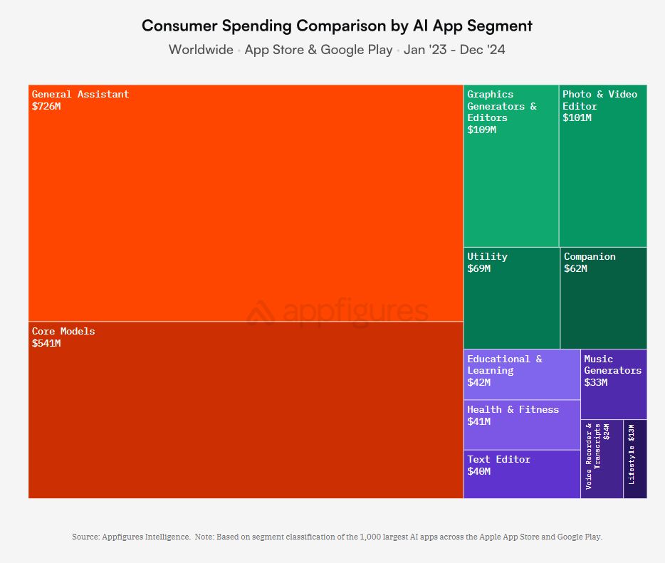 Среди сегментов ИИ-приложений по деньгам в 2024 году лидировали чат-боты-ассистенты. На них пришлось $726 млн пользовательских платежей рынка мобильных приложений. На втором месте большие языковые модели ((GPT, CoPilot и Claude) — $541 млн, на третьем — ИИ-приложения для графики создания изображений — $109 млн.
