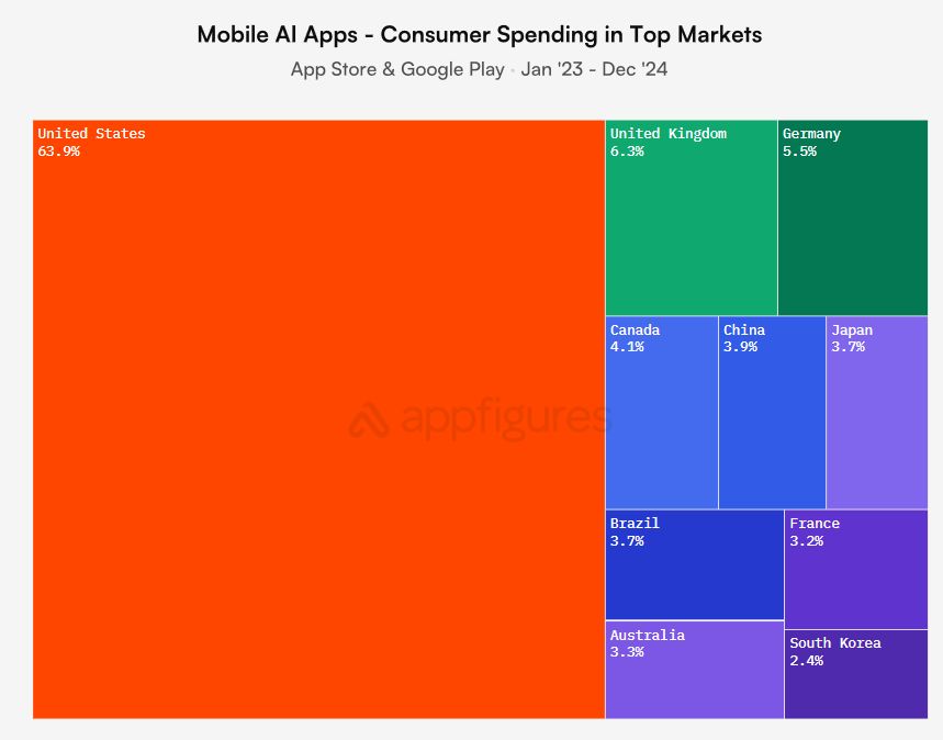 На долю США в распределении доходов в 2024 году пришлось 64% пользовательских денег за мобильные ИИ-приложения. В пятерке лидеров также Великобритания (6%), Германия (5%), Китай и Канада (по 4%). Россия в десятку по объемам рынка мобильных приложений с ИИ не входит (или не учитывается в рейтинге).