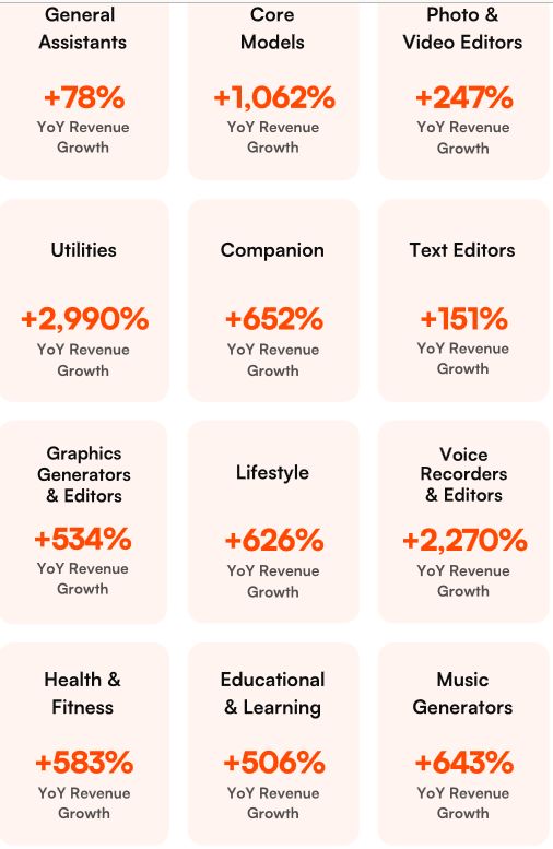 По росту заработанных денег в ИИ-приложениях в 2024 году к 2023-му лидируют утилиты для разработчиков (+2990%), приложения для распознавания и обработки голоса (+2270%) и большие языковые модели (+1062%).