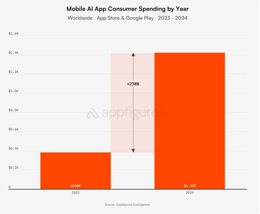 В 2024 году мировой рынок мобильных приложений с искусственным интеллектом достиг объема $1,8 млрд при росте на 274% к 2023-у, говорится в отчете аналитического сервиса Appfigures. За два года рост еще более внушительный: если на приложения с ИИ в январе 2023-го было потрачено всего $5 млн, то в декабре 2024-го в 37 раз больше — $176 млн.