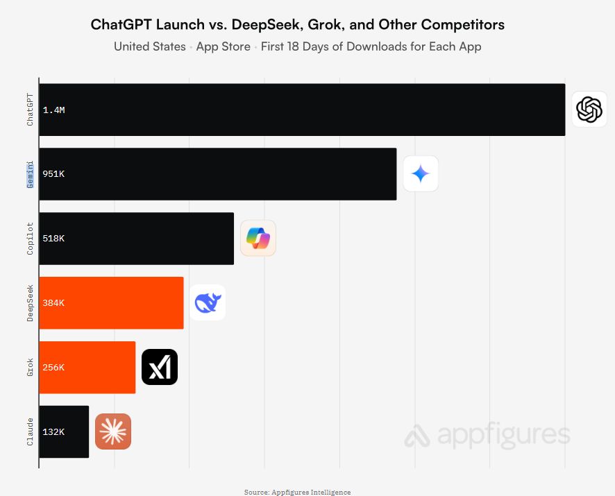 У других, более молодых моделей ИИ большое будущее, хотя стартовали они хуже, чем ChatGPT. В первые 18 дней после запуска, детище OpenAI скачали на App Store 1,4 млн раз, Gemini — 951 тыс. раз, Copilot — 518 тыс., Deepseek — 384 тыс., Grok — 256 тыс., Claude — 132 тыс.
