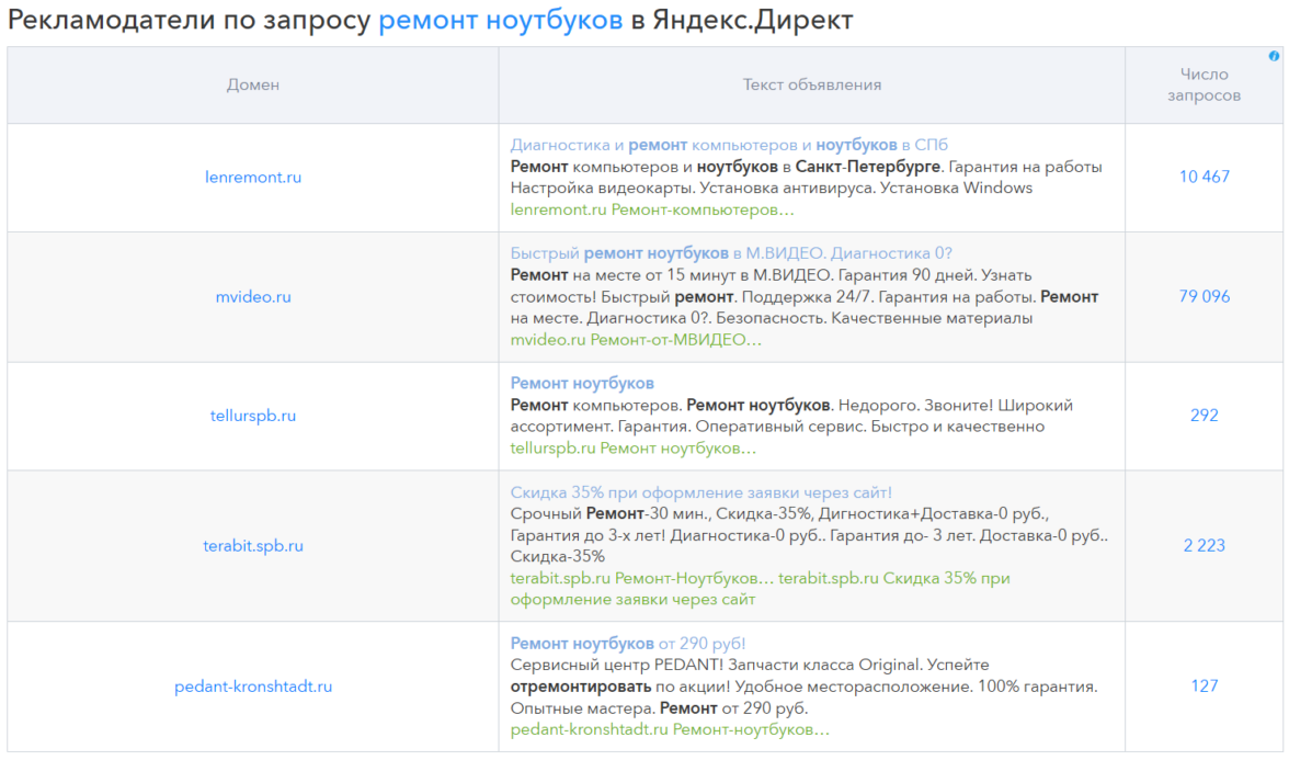 Вот пример с анализом объявлений конкурентов в Яндекс Директ с запросом «ремонт ноутбуков [Санкт-Петербург]» в сервисе SpyWords.