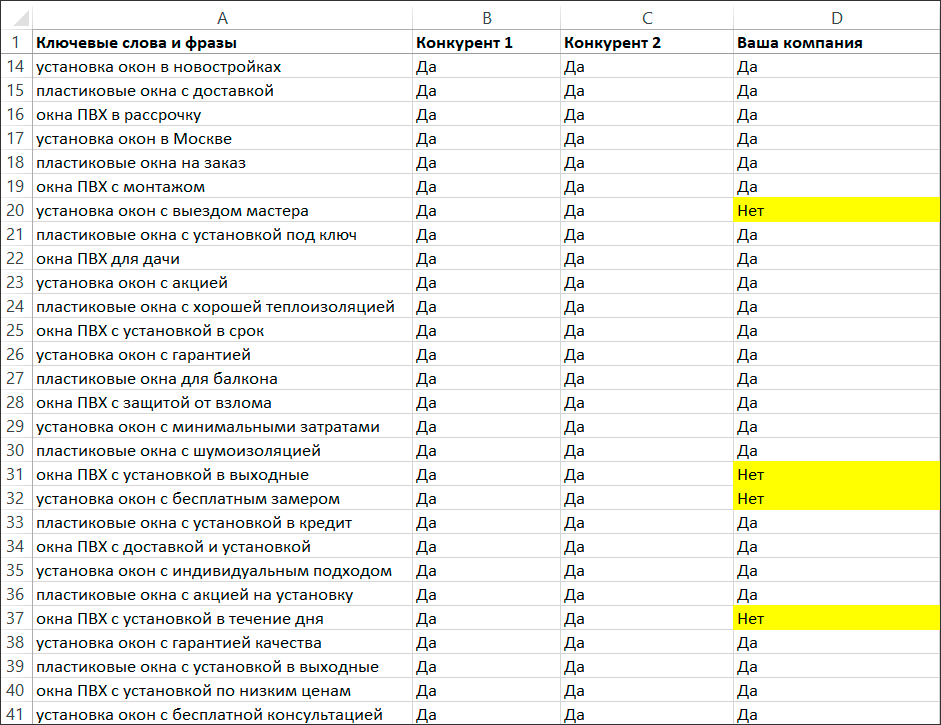 Что это даст: Этот анализ поможет оптимизировать рекламные кампании и точнее таргетировать рекламу на упущенную аудиторию. Составьте таблицу и выделите запросы, которые вы не используете. Добавьте их в свои рекламные кампании.